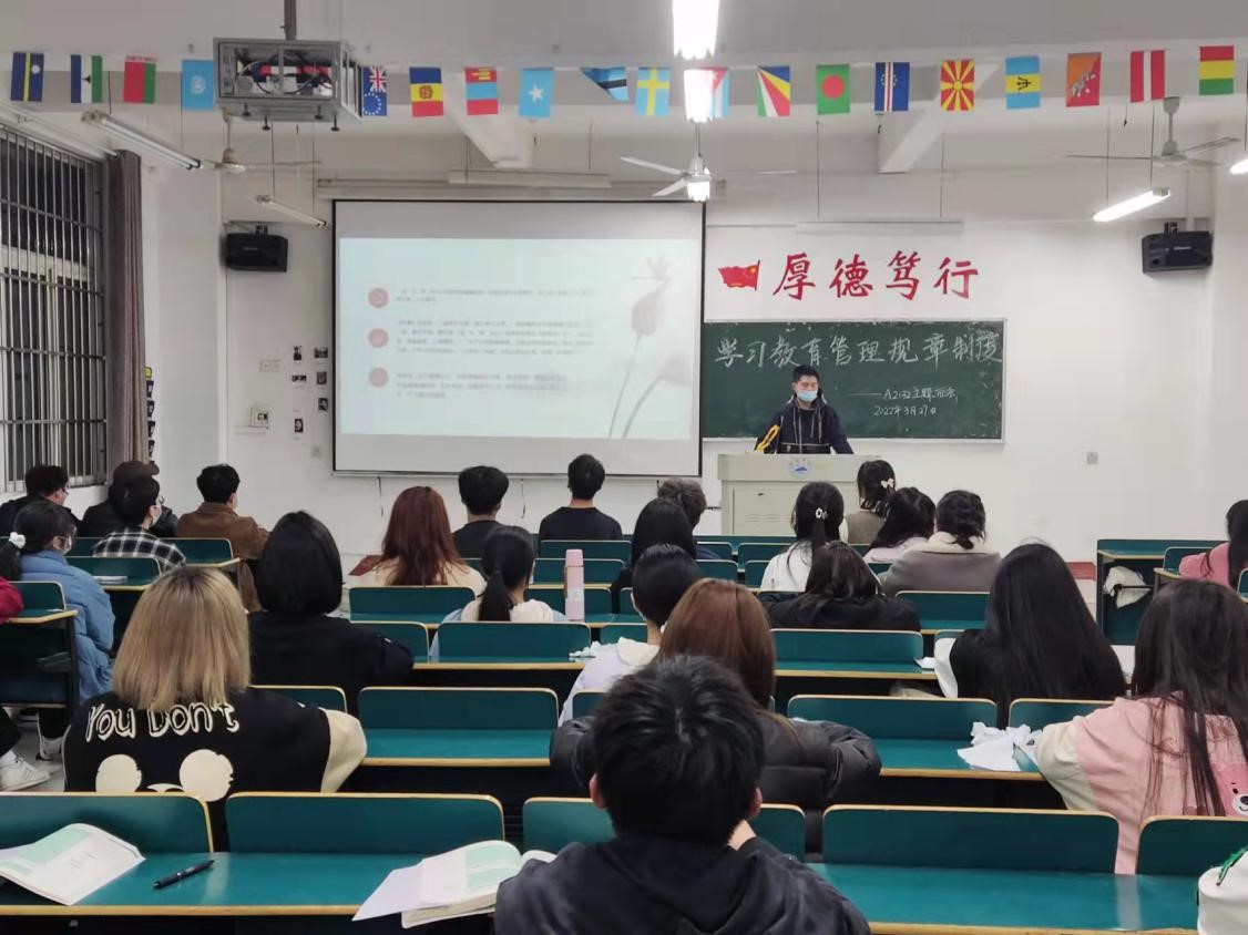 为进一步深入学习教育部教育管理规章制度,切实增强学生遵章守纪意识,3月21日晚,bw必威西汉姆联官方网站于义丰楼组织开展以“学习教育管理规章制度,增强遵章守纪意识”为主题的班会。本次班会由各班团支书主讲,bw必威西汉姆联官方网站全体学子参与。