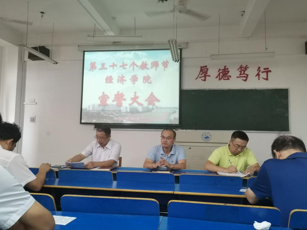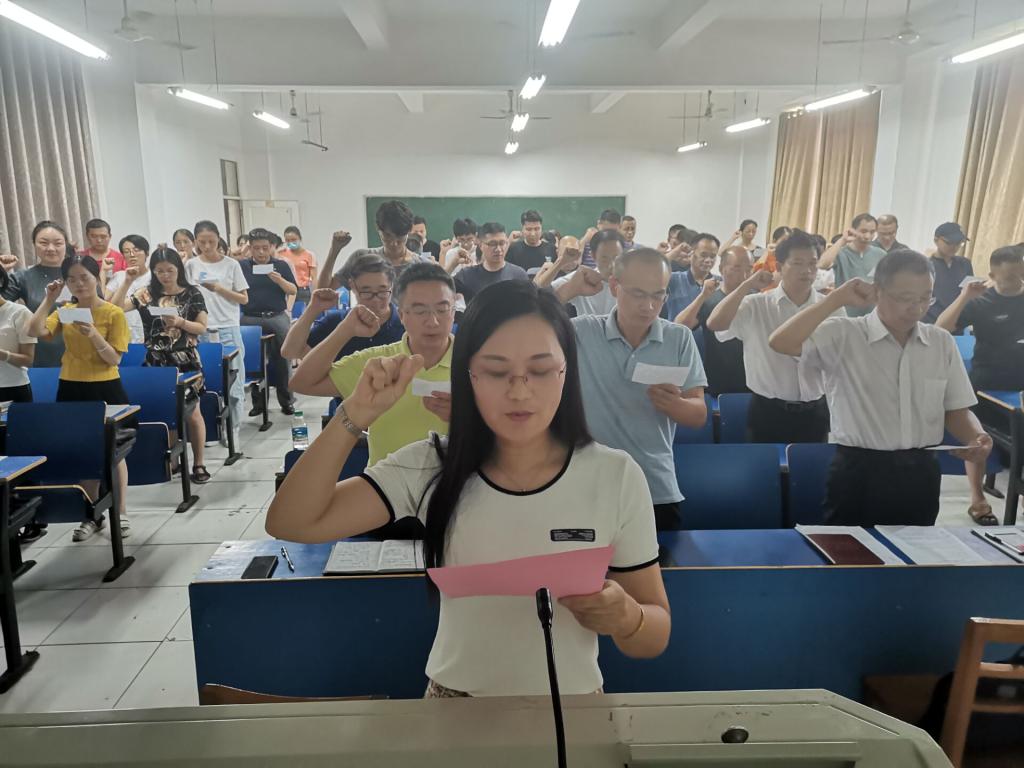 在学校立德树人楷模、国际贸易教研室张敏老师领誓言下,全体教师庄重宣誓:“我志愿做一名光荣的人民教师,忠于人民的教育事业,全面贯彻教育方针,恪守教师职业道德,树立科学教育发展观,育人为本,关爱学生,为人师表,弘扬正气,传承文明,开启智慧,积极面对生活,终身学习,开拓创新,淡泊名利,爱岗敬业,为人民的教育事业奉献一切。”