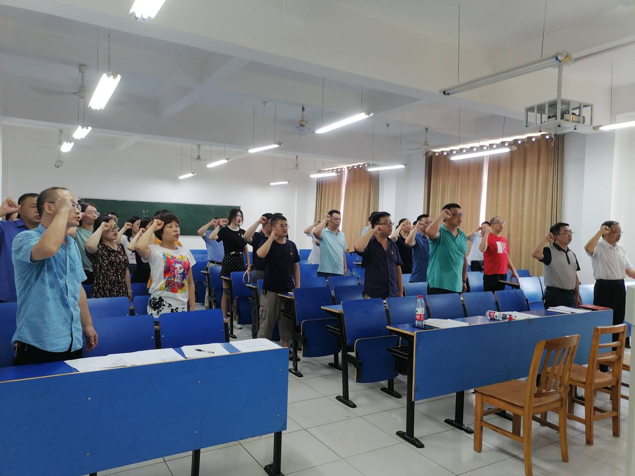 表彰结束后,漆晗东书记带领全体党员重温入党誓词,并给全体党员讲授了题为《举起右拳,面对鲜红党旗》的微党课,系统讲解了入党誓词的演变过程。