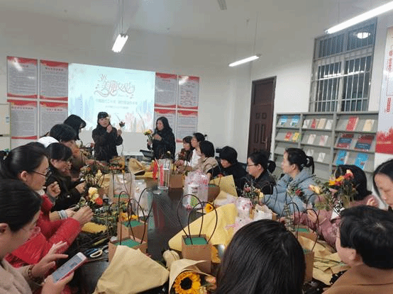 紧接着进行的是“插花秀”,二十多名女教工兴致盎然,跟着老师的示范,按比例剪裁花枝、整理花朵,从不同方位插入花枝,原本略显杂乱的花枝被修剪得有模有样、错落有致、互相呼应。大家发挥自己的想象力和创造力,拼接出了一盆盆富有艺术感的插花作品。