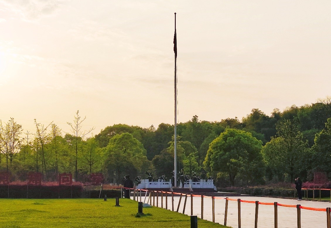 晨光熹微,全体学生准时来到西门广场前列队集合,昂首挺胸,肃穆而立,静待庄严时刻的到来。上午6时30分,随着军靴声、口号声由远及近,英姿挺拔的国旗护卫队护卫着鲜艳的五星红旗,迈着整齐划一、铿锵有力的步伐入场,升旗仪式正式开始。彤彤旭日,熠熠朝霞,伴随着雄壮激昂的《义勇军进行曲》,五星红旗冉冉升起,随风飘扬,全体学生高唱国歌,行注目礼。