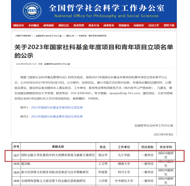 近日,从全国哲学社会科学工作办公室官网获悉,bw必威西汉姆联官方网站张应华博士申请的2023年国家社科基金年度项目获得立项公示。这是张博士自2018年获得国家社科基金立项资助以后的第二个国家社科项目。张博士2022年刚刚完成上一个国家社科基金项目,并没有丝毫松懈和歇歇脚的想法,而是继续申报2023年国家社科基金项目,经过5个多月的反复修改与精心打磨,终于收获喜讯。
