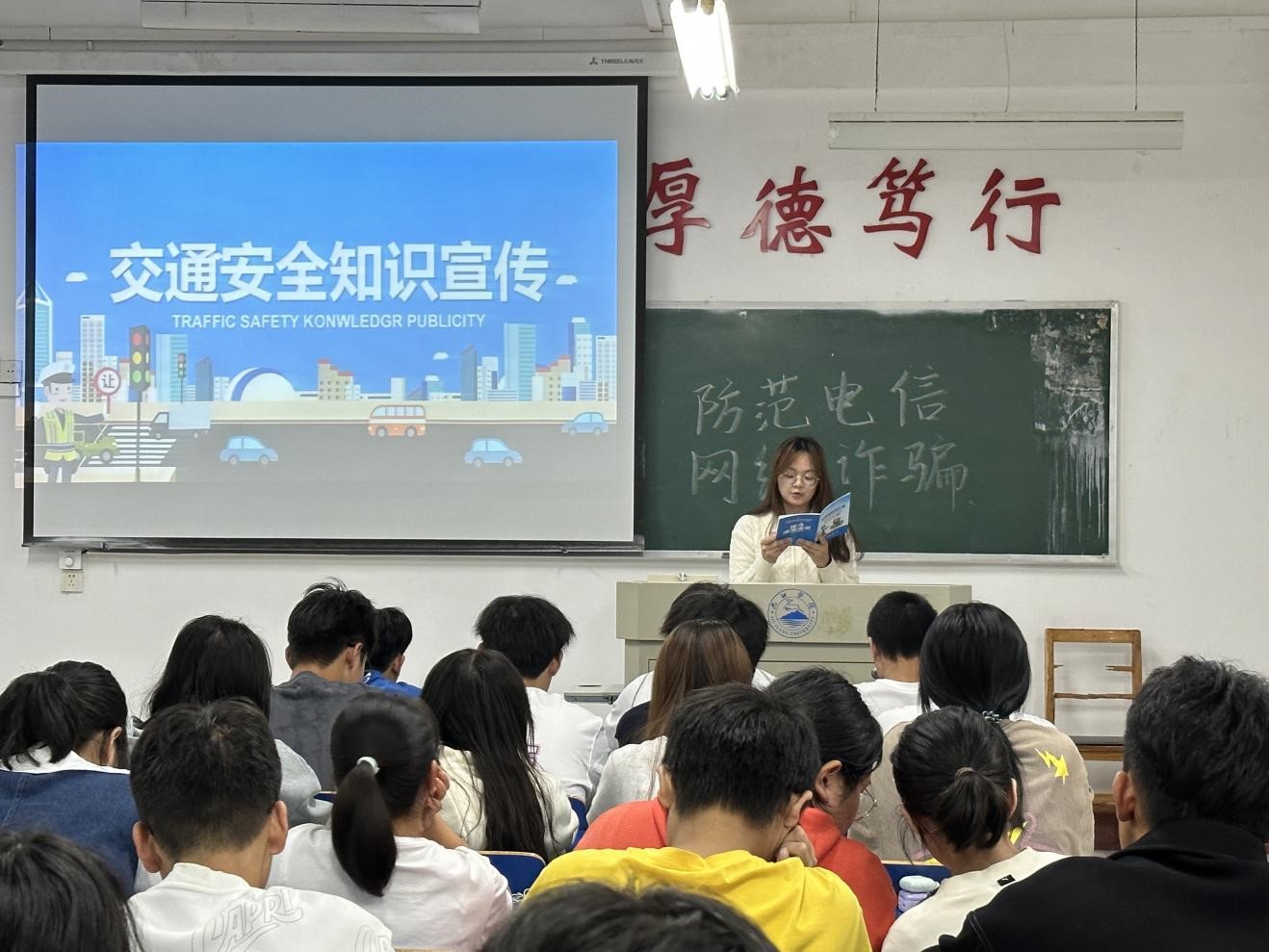 首先,宣讲人播放了相关交通事故的视频,用每一个触目的事故场景,每一位事故亲人的悲痛,告诉在座同学交通安全的重要性,需加强对交通安全的重视。接着,宣讲人结合PPT文件,向同学们详细地介绍交通安全知识并阐述了道路安全要求。最后,宣讲人带领各班同学宣读交通安全知识,要求做到每个人都熟悉于心,铭记于心。