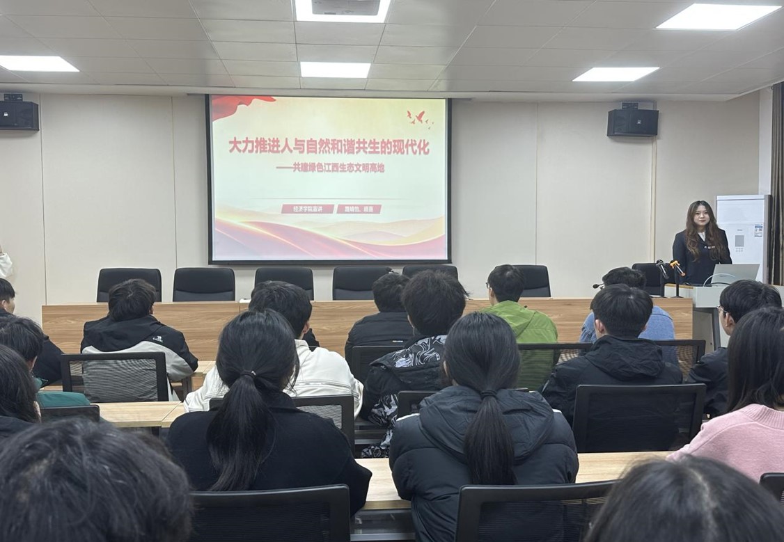 活动中,宣讲人列举江西九江巨变沧桑40年的事例。以九江为例,从长江文化中读懂中国式现代化,进一步强调了建设生态文明现代化的重要性。最后,宣讲人以习近平总书记在中国共产党第二十次全国代表大会上的报告为结尾,再次向在座同学们传递人与自然和谐共生,积极推进现代化的思想。