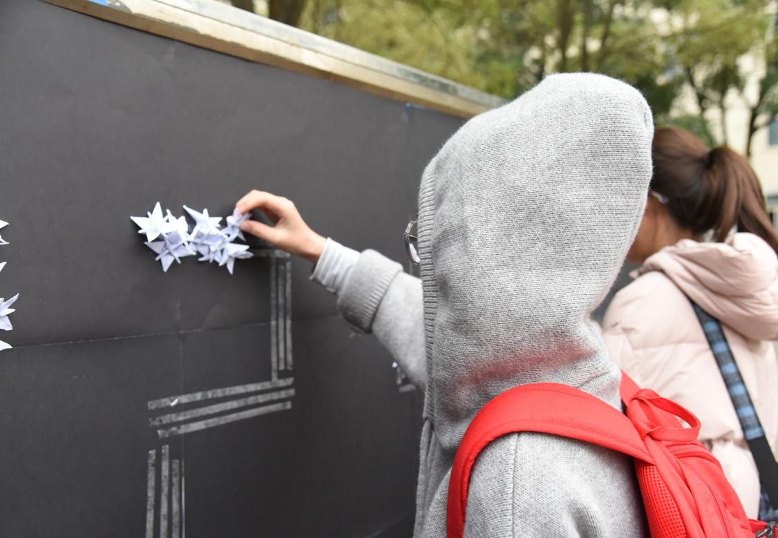活动上,同学们在沉重的背景音乐下进行签名活动,在条幅上签上了自己的名字以示悼念。同时在便利贴上写上自己对南京大屠杀的感想,表示对逝者的缅怀、对祖国的期盼,随后粘贴到宣传白板上。志愿者们为前来参加活动的同学们发放纸花,同学们有序粘贴在展板上。纸花最后以12.13的样子呈现出来。傍晚时分志愿者们在活动现场以12.13的字样摆放蜡烛,同学们在蜡烛前低下头祈祷,默哀。
