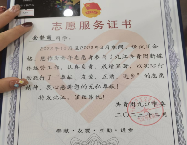 在大学生活中,余静萌不仅是大家学习的榜样,还是一名优秀的志愿者。在九江市新媒体中心运营部编辑组,余静萌工作了一年的时间,她在职场中学习到了很多,一次次的肯定让她更加自信。