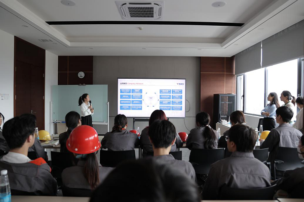 接着天赐战略规划、财务管理、人力资源管理、安全合规等部门负责人分别通过视频和PPT展示企业市场竞争、资金运转、投融资业务、人才培养规划、企业产品板块等业务,讲述了企业与商业银行等金融机构之间的关系,还欢迎同学们毕业后加入天赐。