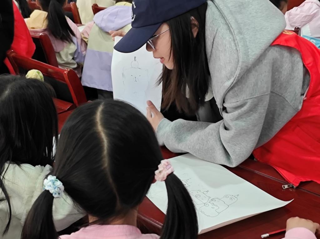 活动开始,志愿者们为每一位小朋友发放素描纸和铅笔,然后志愿者站在讲台讲解简笔画的各个步骤。小朋友们认真跟随志愿者和ppt的步骤进行简笔画的绘制。期间部分小朋友们跟不上其他人的进度,志愿者们会耐心温柔地指导他们,让他们完成简笔画的绘制。对于理解能力稍弱的小朋友,更是给予额外的关注与耐心,反复示范,直至其掌握各个步骤。志愿者们除了让小朋友们完成ppt上简笔画的绘制,还让他们自由绘画,使小朋友们发挥自己的想象力和创造力。