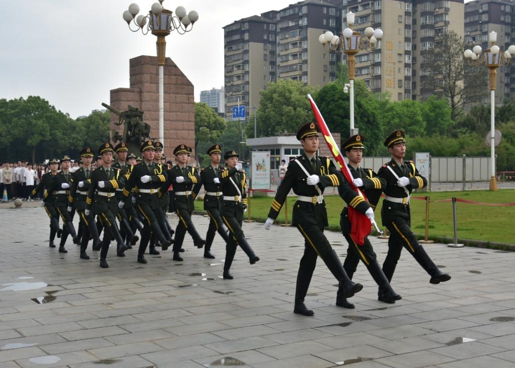 升旗仪式正式开始。国旗护卫队队员们步伐整齐、英姿飒爽,护卫着五星红旗缓缓走向升旗台。他们身姿挺拔,每一步都铿锵有力,展现出对国旗的敬重与守护的决心。现场全体学生屏息凝神,目光紧紧追随。