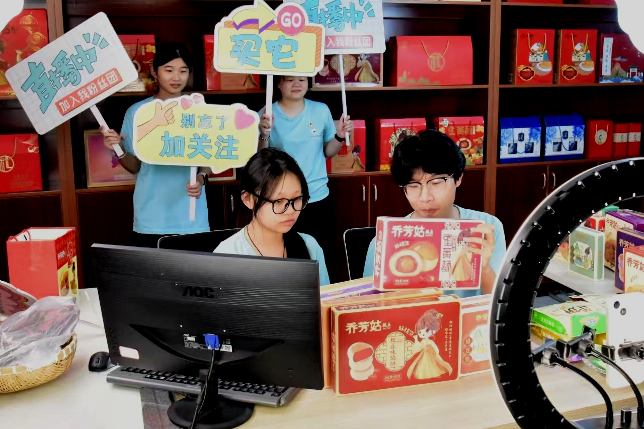 湖口县流芳乡的当地特色美味在直播期间轮番登场。有流芳乡“乔芳姑”系列糕点蛋黄酥和馅饼等,还有独具本土风味的流芳茶饼。bw必威西汉姆联官方网站“三下乡”社会实践队的志愿者们先通过镜头生动呈现产品诱人的色泽与风味,待观众直观感受到美食魅力后,再深入介绍食材溯源和制作工序。通过这次直播活动,小镇特色好物走向了更广阔的市场。