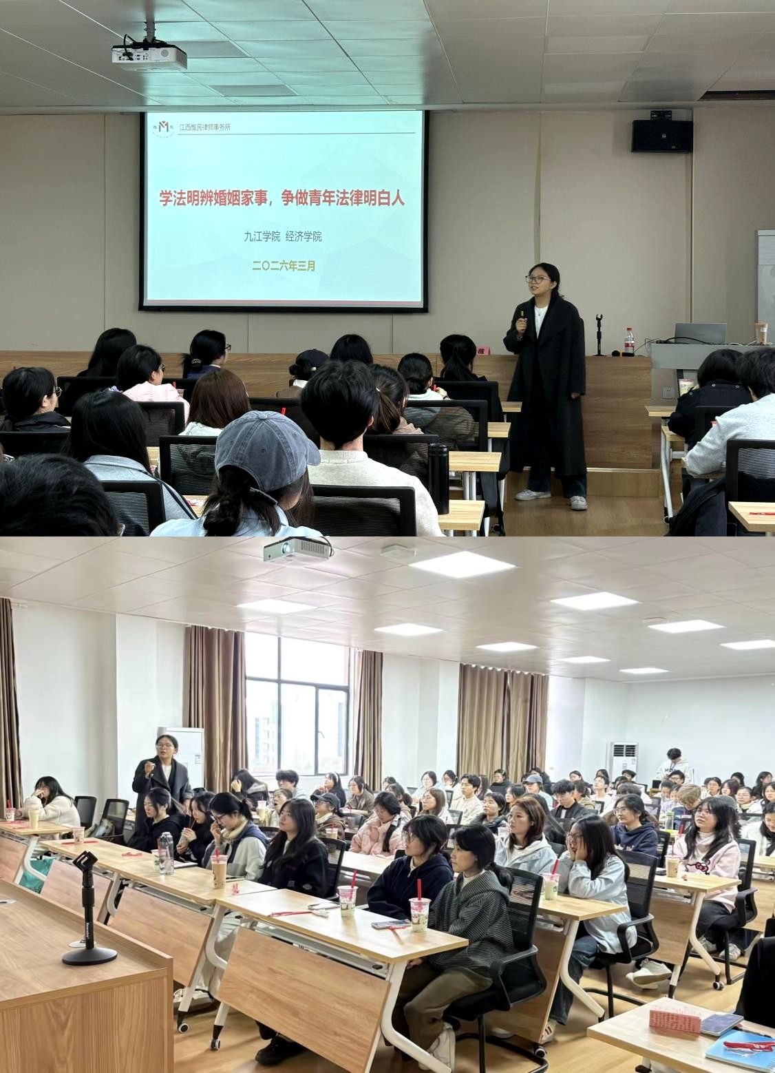 活动伊始,黄薇律师围绕《中华人民共和国民法典》婚姻家庭编进行系统讲解,结合典型案例,深入解读夫妻共同财产认定、个人财产保护、婚姻关系中的权利与义务等核心内容,以通俗易懂的语言阐明法律条文背后的权益保障逻辑,引导青年学生树立“婚前懂法、婚后守法”的法治意识。随后,黄薇律师聚焦婚恋纠纷与家庭矛盾的常见类型及解决途径,结合真实案例,引导同学们在情感冲突、财产争议中保持理性,善用法律武器维护自身合法权益;同时围绕婚前财产约定、遗嘱继承、家庭责任划分等家事法律实务展开讲解,贴合当代青年婚恋与家庭规划需求,为大家的人生规划提供专业指导。