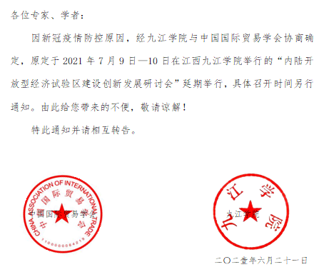 关于延期举行“内陆开放型经济试验区建设创新发展研讨会”的通知