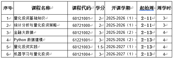 学制1.5年(3个学期),共14.5学分,学生在规定时间内修满培养方案规定的全部课程且考核合格后,可获得bw必威西汉姆联官方网站《量化投资》微专业学习证明书。