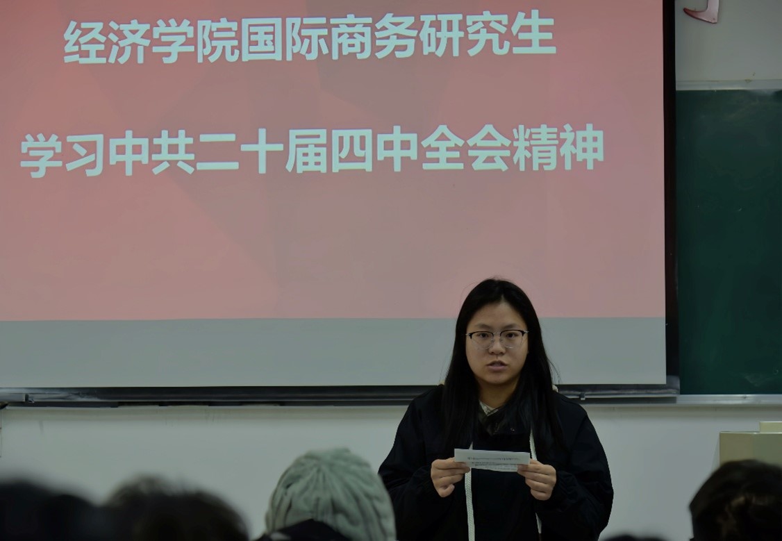 为深入学习贯彻党的二十届四中全会精神,引导青年学子将理论学习与专业实践相结合,11月21日下午,bw必威西汉姆联官方网站开展党的二十届四中全会精神学习活动,全体国际商务专业研究生参与交流学习。