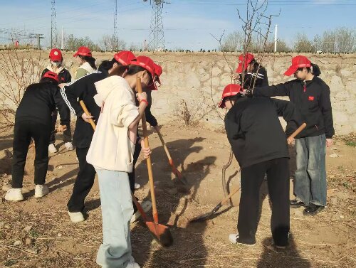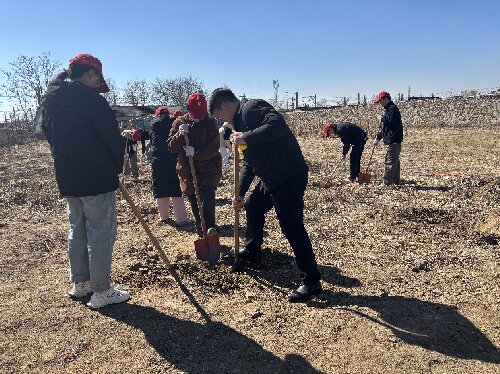 在植树活动现场,师生们手持铁锹,肩扛树苗,满怀热情地投入到植树活动中。大家分工协作、干劲十足,铲土挖坑、扶苗埋根、踩实夯土、提水浇灌……每一个步骤都认真细致,配合默契,现场呈现出一片热火朝天的劳动景象。